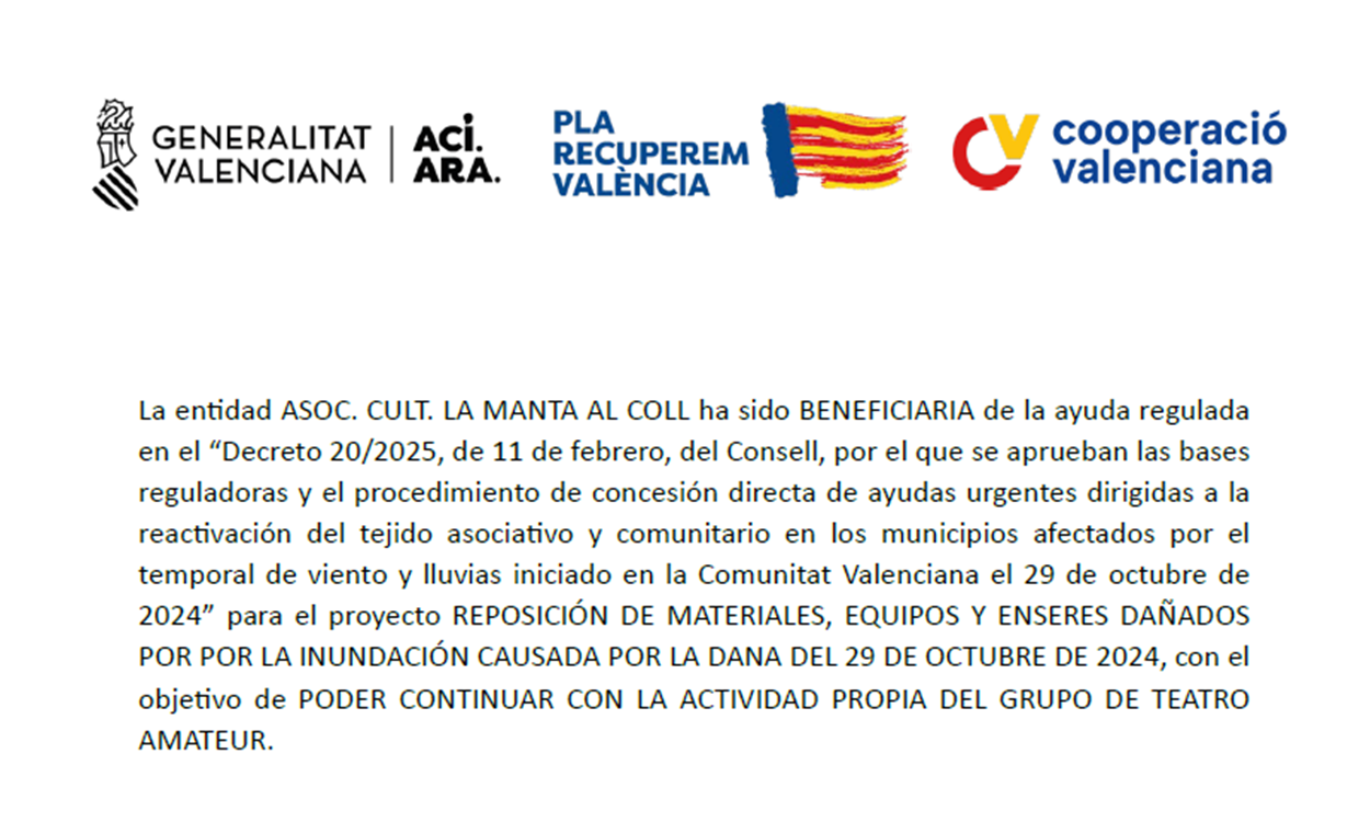 El Grupo de Teatro “La Manta al Coll” comenzó su andadura teatral en 1989, y ha venido desarrollando su actividad ininterrumpidamente, actuando en multitud de poblaciones dentro del programa del SARC, y en un gran número de Muestras y Concursos, como los de Valencia(Talía), Alzira, Alginet, Ibi, Utiel, Elda, Carcaixent, Cocentaina, Cheste, Requena, Torrent, La Nucia, La Llosa de Ranes, Benetússer, etc., obteniendo diversos premios. Hasta la fecha ha realizado 18 montajes, 2 reposiciones y más de 260 representaciones. Actualmente tiene en su repertorio las obras: